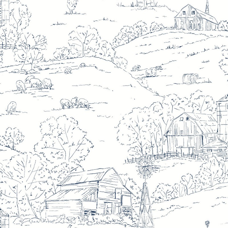 | An afternoon of peaceful outdoor sketching may have yielded this rural landscape complete with grazing sheep, curious hens, rustic barns, hay bales, and windmills; a breath of fresh air, this is Pasture Toile Wallpaper. Unpasted - Washable - Strippable Packaged and sold as a double roll Repeat: 20.5 in. Match: Drop Simply Farmhouse Toile |