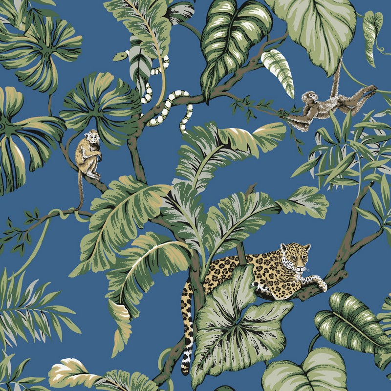 | Pattern Jungle Cat places jaguars and monkeys in a canopy of tropical palm trees for a look with exotic flair. Unpasted - Washable - Strippable Packaged and sold as a double roll Repeat: 25.25 in Match: Drop Ronald Redding Traveler |