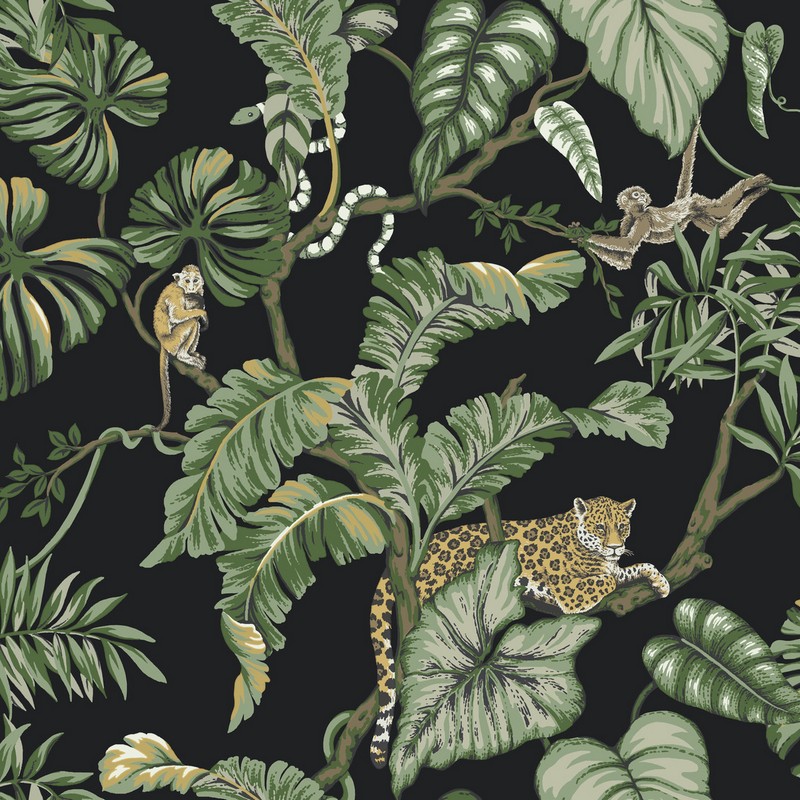 | Pattern Jungle Cat places jaguars and monkeys in a canopy of tropical palm trees for a look with exotic flair. Unpasted - Washable - Strippable Packaged and sold as a double roll Repeat: 25.25 in Match: Drop Ronald Redding Traveler |