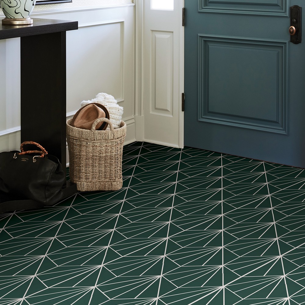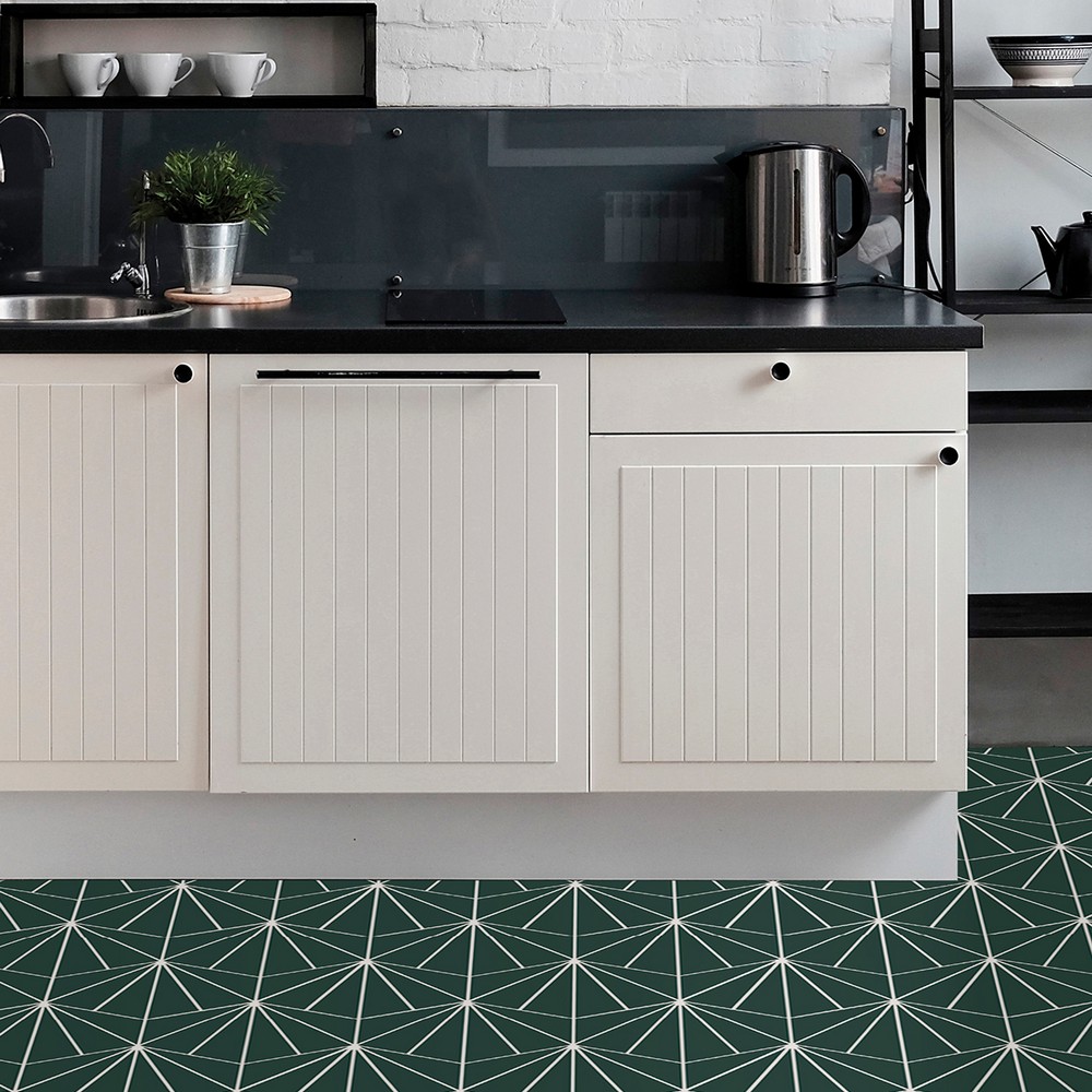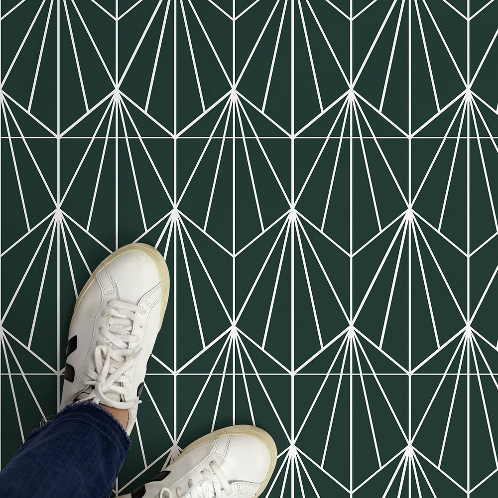 FloorPops current Brand: FloorPops Match: NA Sheet Length: 12 Sheet Width: 12 # of Sheets: 10 Emerald green geometric peel and stick floor tiles with a mid-century current style Peel and stick to apply Easy installation - no grout or special tools needed Water resistant and washable Virgin Vinyl material with a textured low lustre finish and permanent adhesive makes tiles durable One package contains 10 tiles that each measure .06-in in depth Each tile measures 12 x 12 inches Floor Tiles Geometrics current |