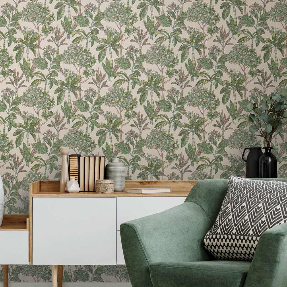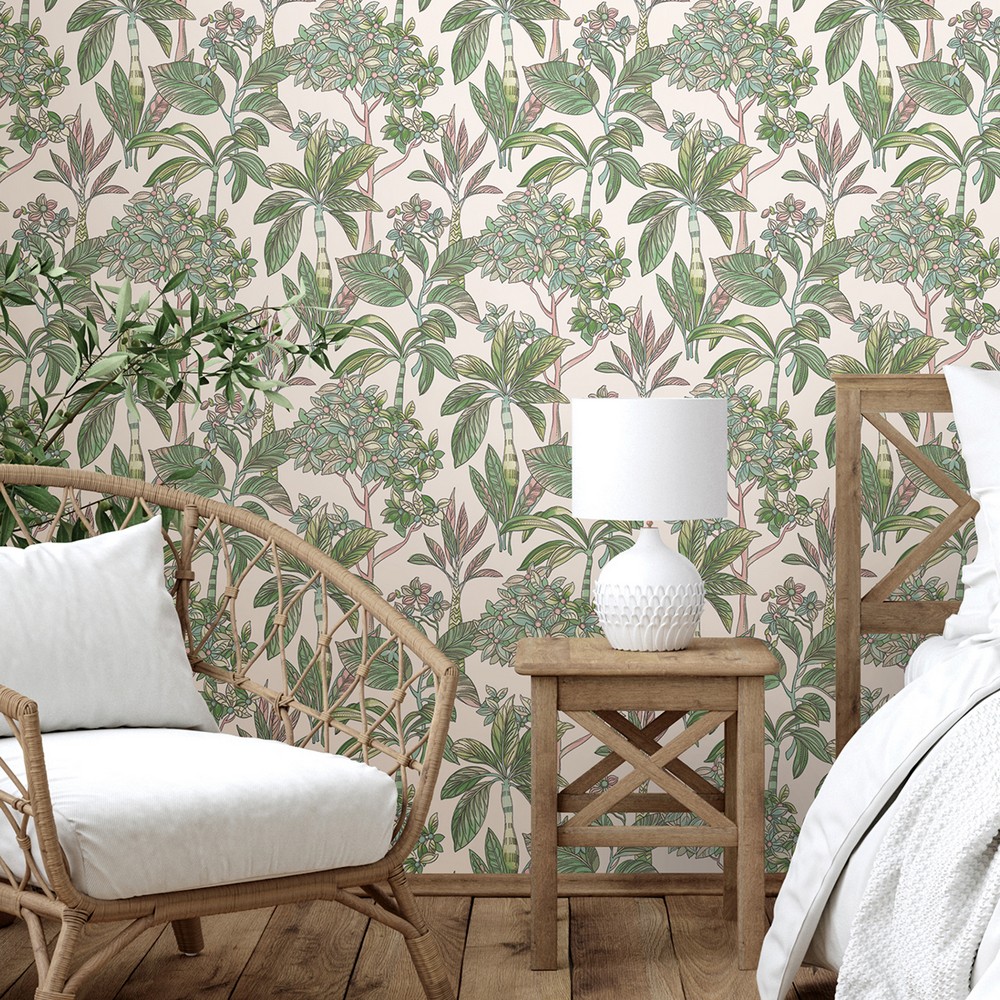 NuWallpaper Tropical Brand: NuWallpaper Match: NA Sheet Length: 216 Sheet Width: 20.5 # of Sheets: 1 Whimsical, green and pink jungle peel and stick wallpaper Peel and stick to apply, pull up to remove NuWallpaper is safe for walls and leaves no sticky residue behind Easily repositionable while installing NuWallpaper sticks to any smooth, flat surface - perfect for DIY projects Ideal for rental or home decorating Comes on a 20.5-in x 18-ft roll and covers about 30.75 sq. ft Design repeat of 21-in Peel & Stick Wallpaper Trees Tropical |