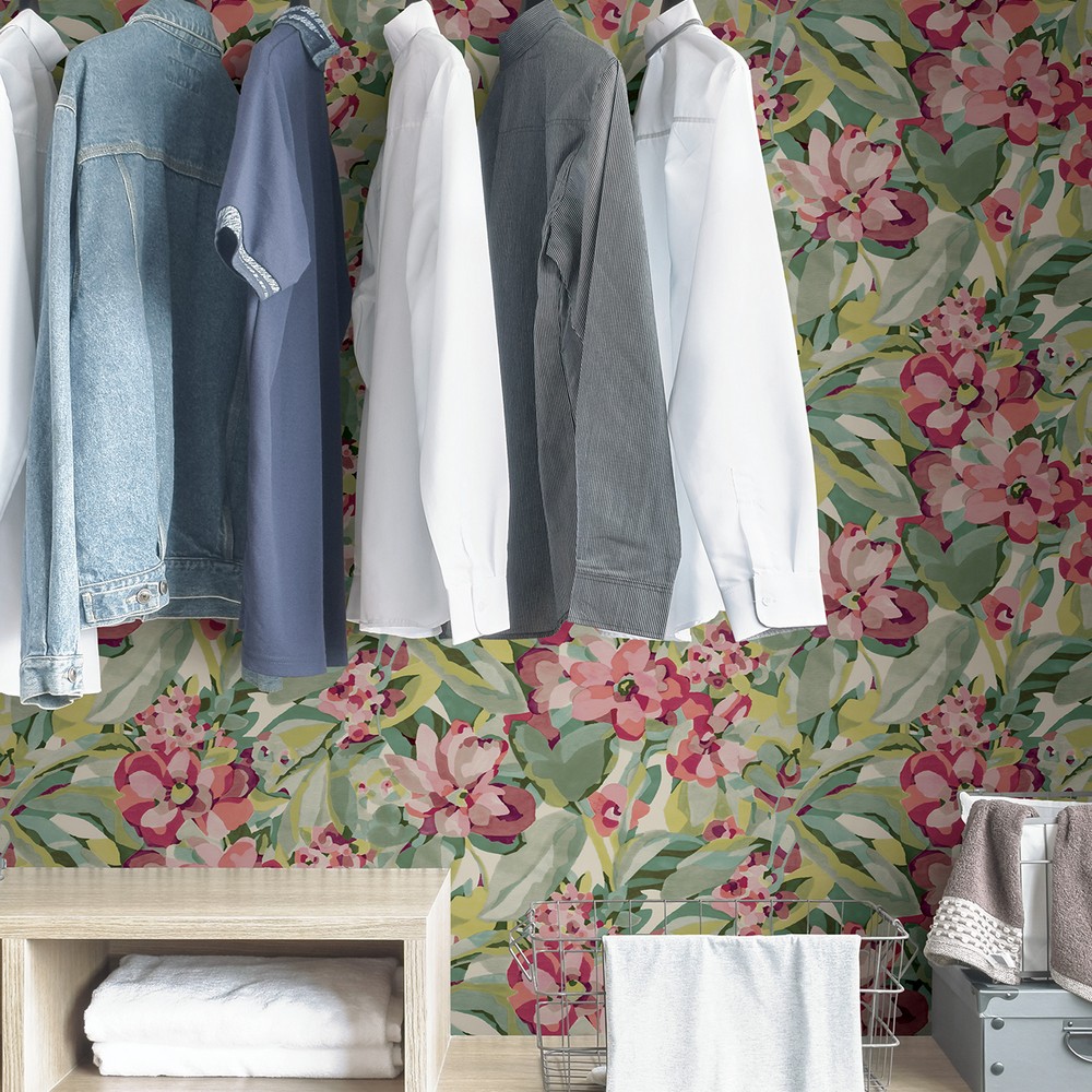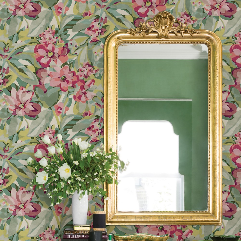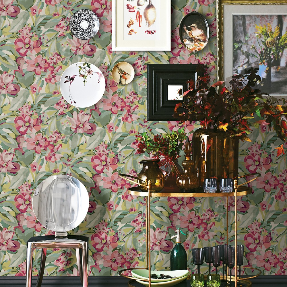 Green and red floral wallpaper by Caroline et Bettina with a painterly style