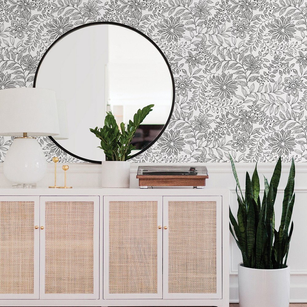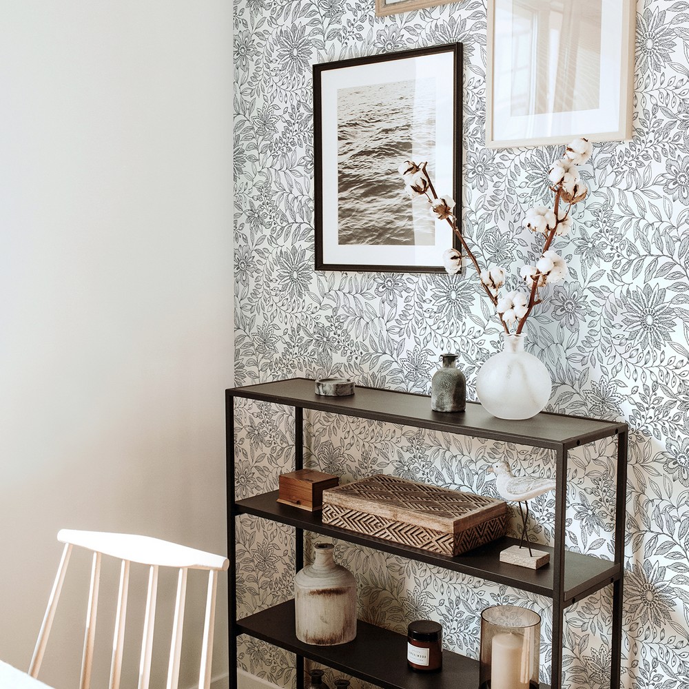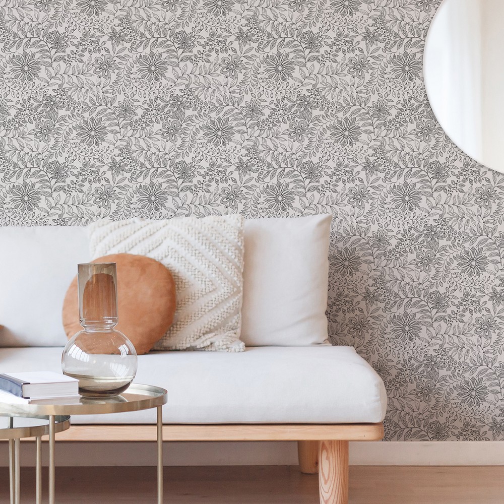Scott Living Match: Straight current Brand: Scott Living Match: Straight Sheet Length: 216 Sheet Width: 20.5 # of Sheets: 1 Scott Living presents black and white illustrative floral self-adhesive wallpaper Peel and stick to apply, pull up to remove Scott Living x NuWallpaper is safe for walls and leaves no sticky residue behind Easily repositionable while installing Scott Living x NuWallpaper sticks to any smooth, flat surface - perfect for DIY projects Ideal for rental or home decorating Comes on a 20.5-in x 18-ft roll and covers about 30.75 sq. ft Design repeat of 20.8-in Peel & Stick Wallpaper Flowers current |