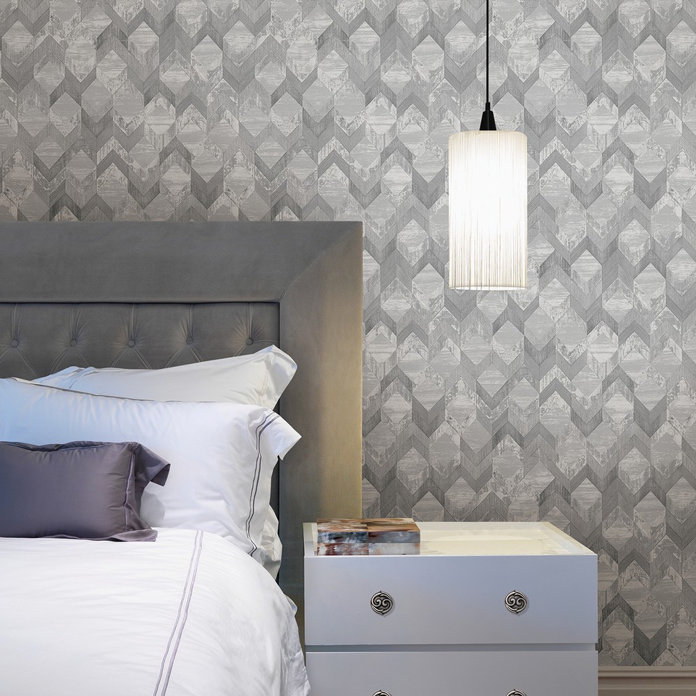 Silver chevron peel and stick wallpaper designed by Rachel Zoe