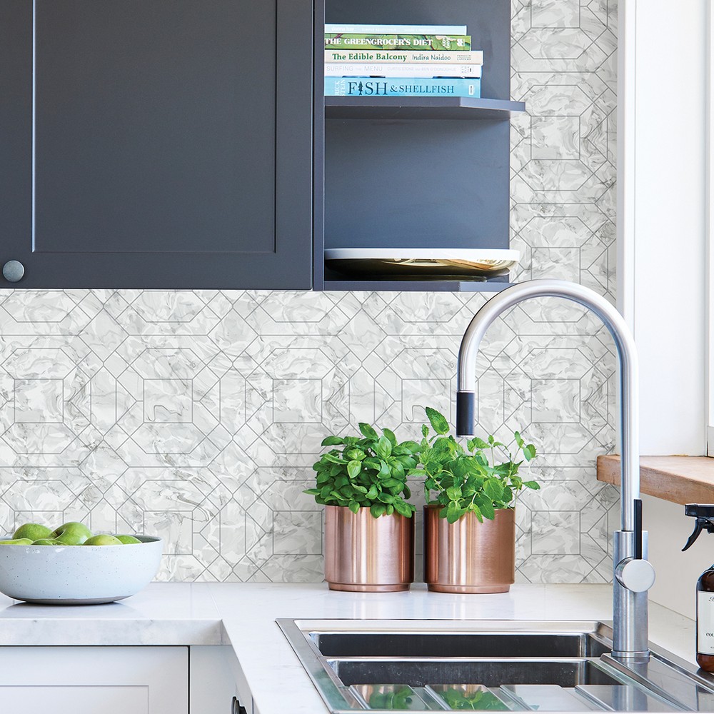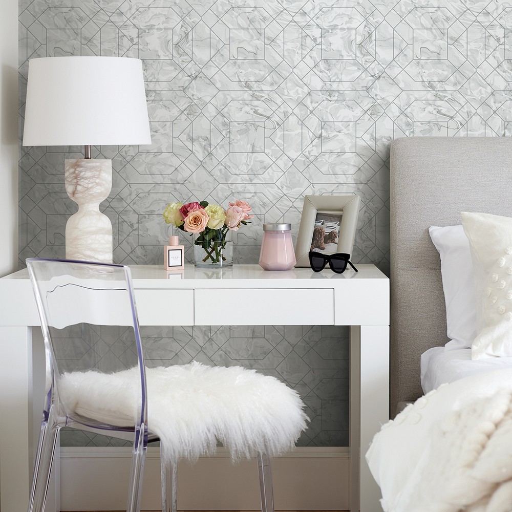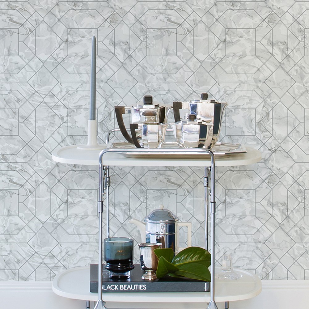 Rachel Zoe Match: Straight Glam Brand: Rachel Zoe Match: Straight Sheet Length: 216 Sheet Width: 20.5 # of Sheets: 1 Silver peel and stick wallpaper with a marble backdrop designed by Rachel Zoe Peel and stick to apply, pull up to remove Rachel Zoe x NuWallpaper is safe for walls and leaves no sticky residue behind Easily repositionable while installing Rachel Zoe x NuWallpaper sticks to any smooth, flat surface - perfect for DIY projects Ideal for rental or home decorating Comes on a 20.5-in x 18-ft roll and covers about 30.75 sq. ft Design repeat of 20.8-in Peel & Stick Wallpaper Geometrics Glam |