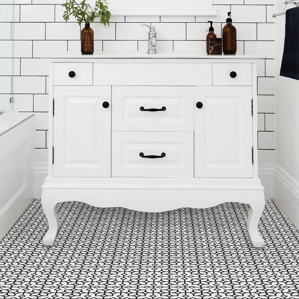 FloorPops current Brand: FloorPops Match: NA Sheet Length: 12 Sheet Width: 12 # of Sheets: 10 Black and white geometric peel and stick vinyl floor tile Peel and stick to apply Easy installation - no grout or special tools needed Water resistant and washable Virgin Vinyl material with a textured low lustre finish and permanent adhesive makes tiles durable One package contains 10 tiles that each measure .06-in in depth Each tile measures 12 x 12 inches Floor Tiles Geometrics current |