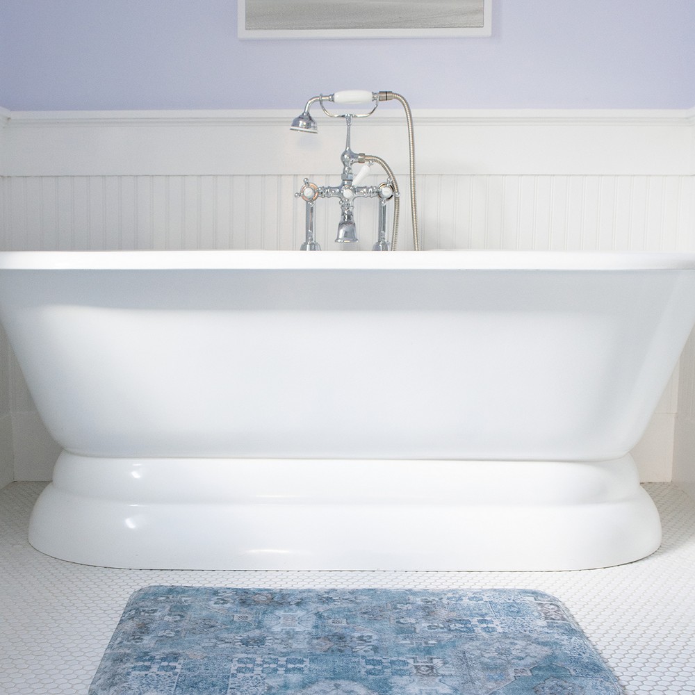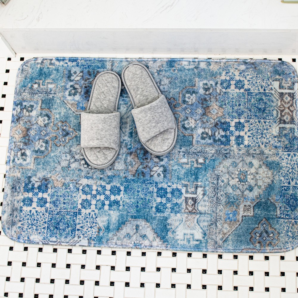 FloorPops Vintage Brand: FloorPops Match: NA Sheet Length: 30 Sheet Width: 20 # of Sheets: 1 Blue vintage rug inspired bath mat Quick dry surface Gentle machine wash, hang dry Do not bleach Flannel surface material with 14mm memory foam filling Non-woven fabric backing with anti-slip knots Mats measure 20-in x 30-in Designed for interior use only Bath Mats Fabric Textures Vintage |