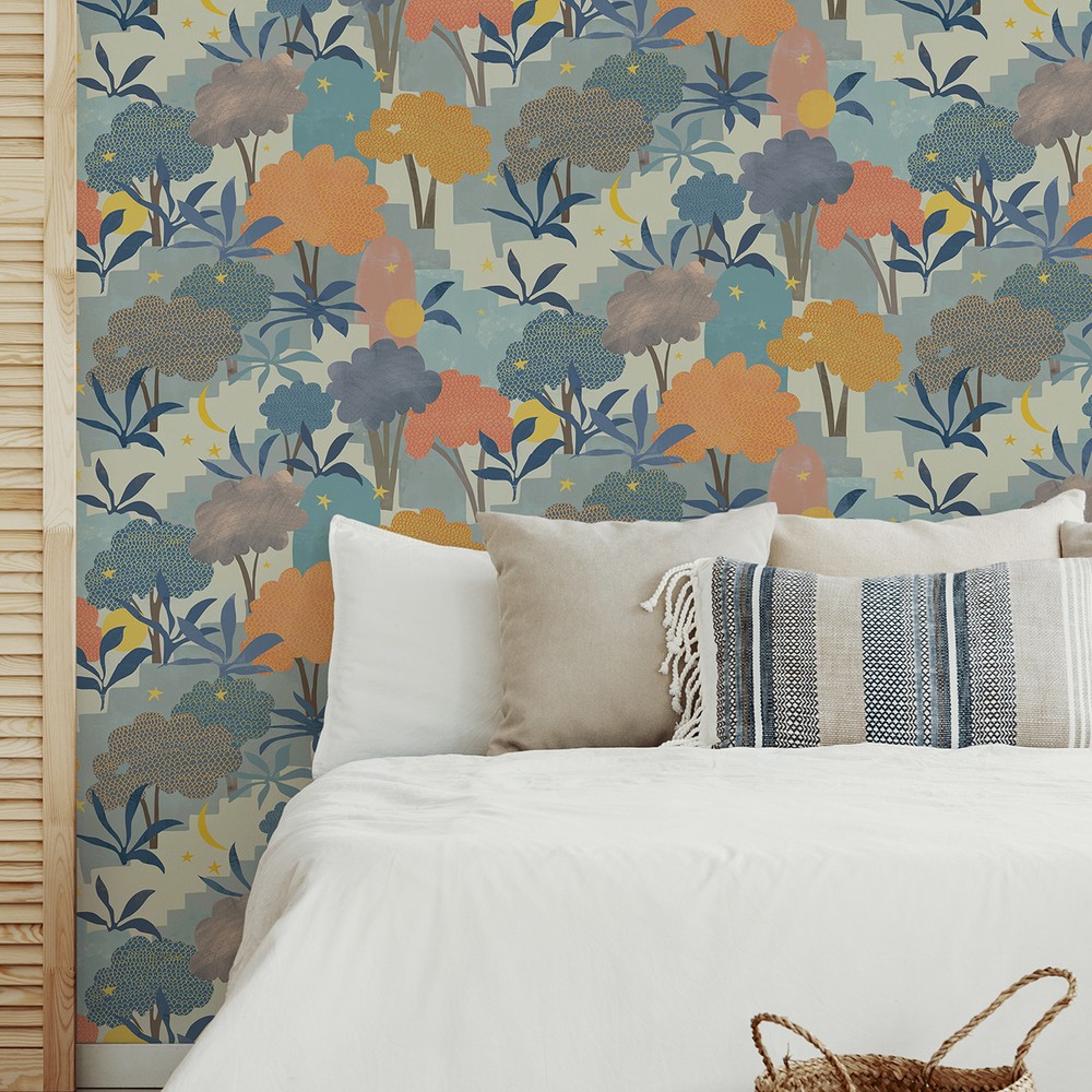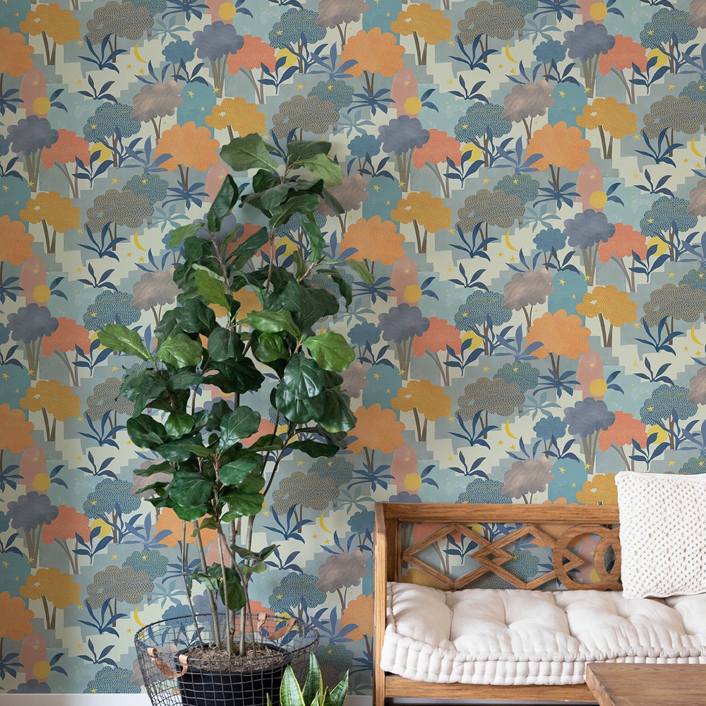 Alja Horvat Match: Half Drop Bohemian Brand: Alja Horvat Match: Half Drop Sheet Length: 216 Sheet Width: 20.5 # of Sheets: 1 Bohemian, blue and orange peel and stick wallpaper featuring trees and ethereal stairwells, designed by Alja Horvat Peel and stick to apply, pull up to remove Alja Horvat x NuWallpaper is safe for walls and leaves no sticky residue behind Easily repositionable while installing Alja Horvat x NuWallpaper sticks to any smooth, flat surface - perfect for DIY projects Ideal for rental or home decorating Comes on a 20.5-in x 18-ft roll and covers about 30.75 sq. ft Design repeat of 10.4-in Peel & Stick Wallpaper Trees Bohemian |