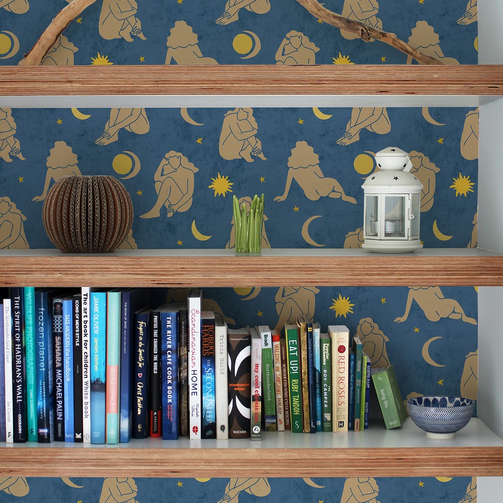 Alja Horvat Match: Straight Bohemian Brand: Alja Horvat Match: Straight Sheet Length: 216 Sheet Width: 20.5 # of Sheets: 1 Bohemian blue peel and stick wallpaper with nude silhouettes and celestial motifs; designed by Alja Horvat Peel and stick to apply, pull up to remove Alja Horvat x NuWallpaper is safe for walls and leaves no sticky residue behind Easily repositionable while installing Alja Horvat x NuWallpaper sticks to any smooth, flat surface - perfect for DIY projects Ideal for rental or home decorating Comes on a 20.5-in x 18-ft roll and covers about 30.75 sq. ft Design repeat of 20.8-in Peel & Stick Wallpaper Novelty Bohemian |