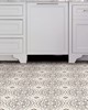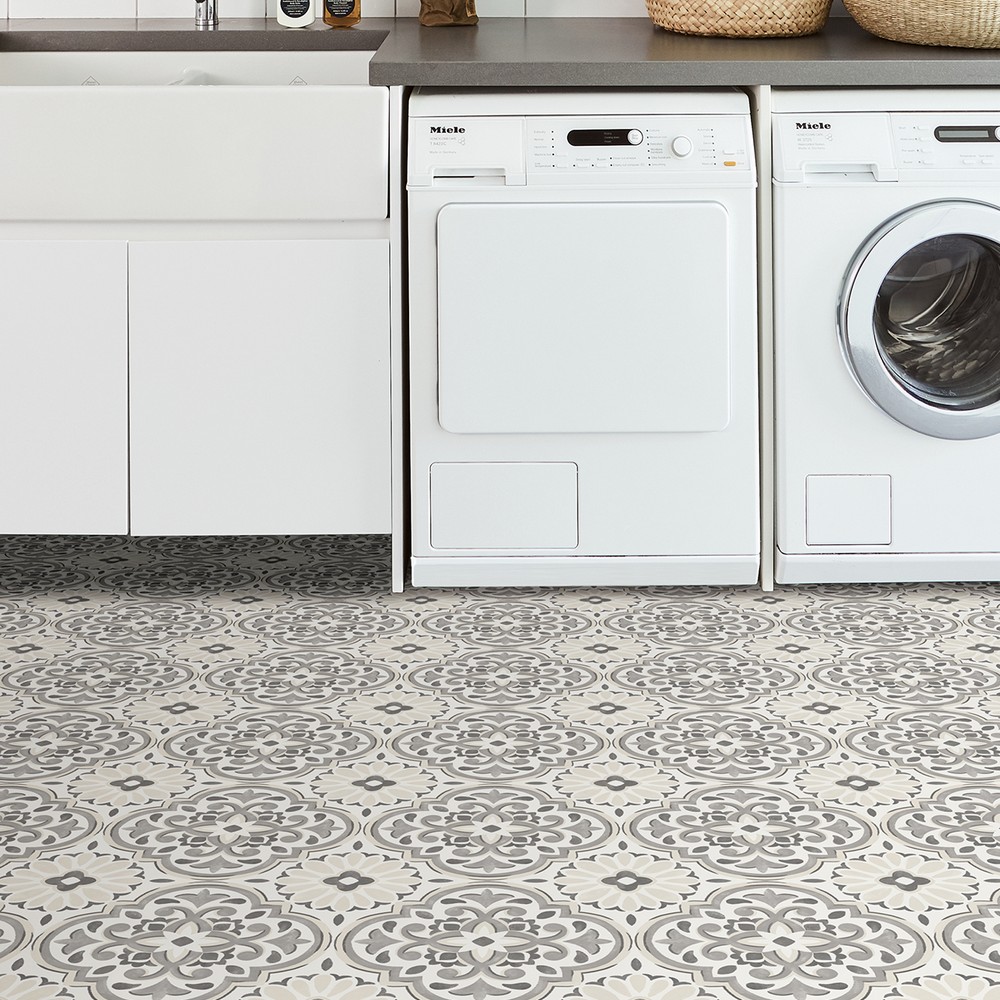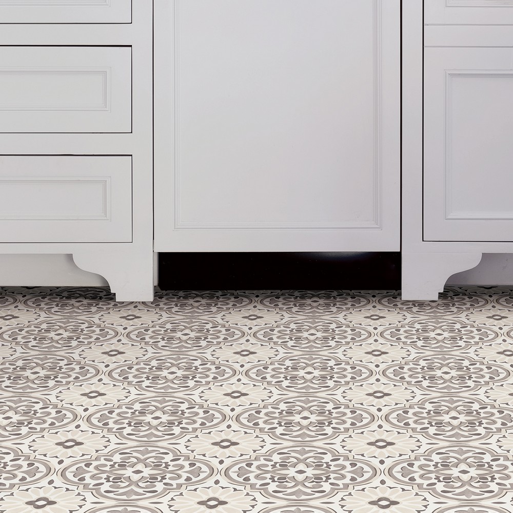 Grey and cream peel and stick vinyl floor tile with a current farmhouse style