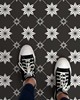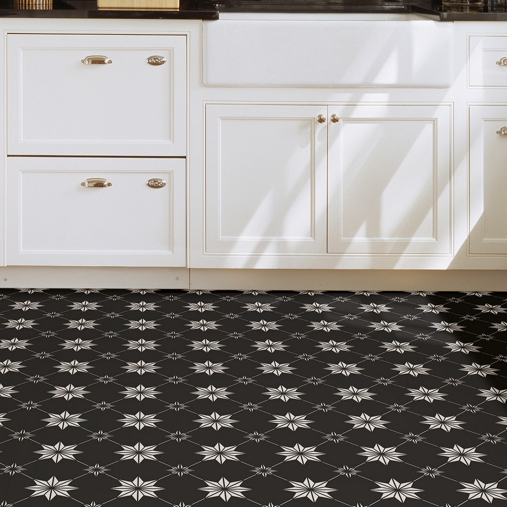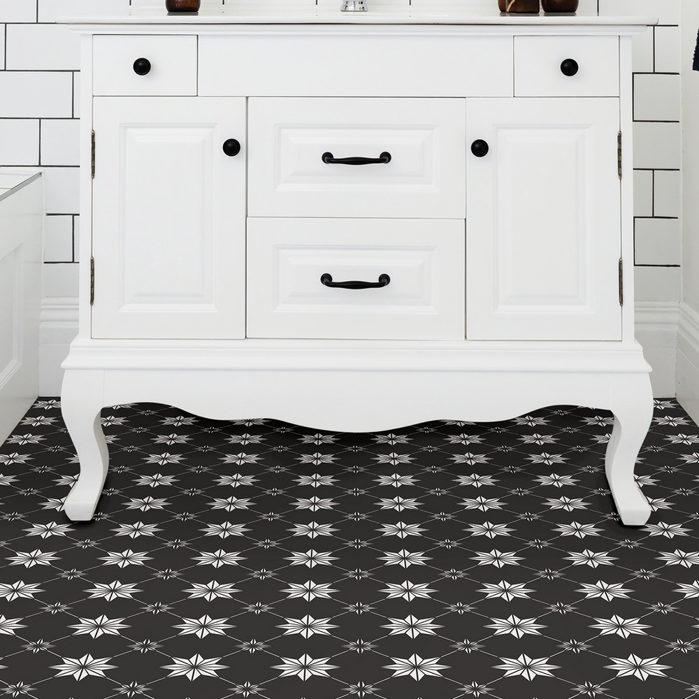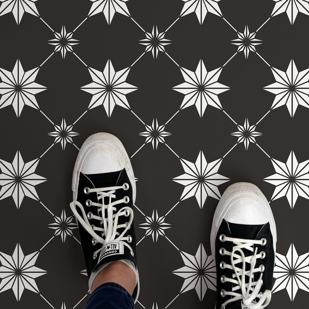 FloorPops current Brand: FloorPops Match: NA Sheet Length: 12 Sheet Width: 12 # of Sheets: 10 Black and white peel and stick vinyl floor tile with a eye-catching and current style Peel and stick to apply Easy installation - no grout or special tools needed Water resistant and washable Virgin Vinyl material with a textured low lustre finish and permanent adhesive makes tiles durable One package contains 10 tiles that each measure .06-in in depth Each tile measures 12 x 12 inches Floor Tiles Stars current |