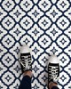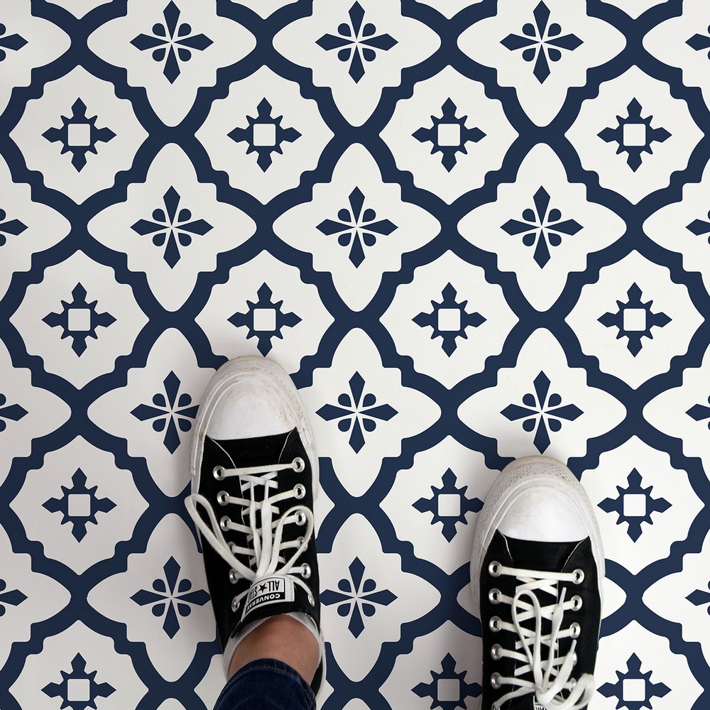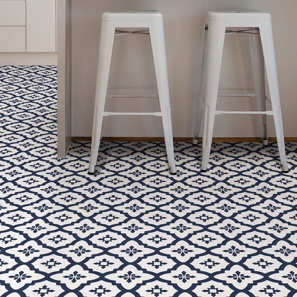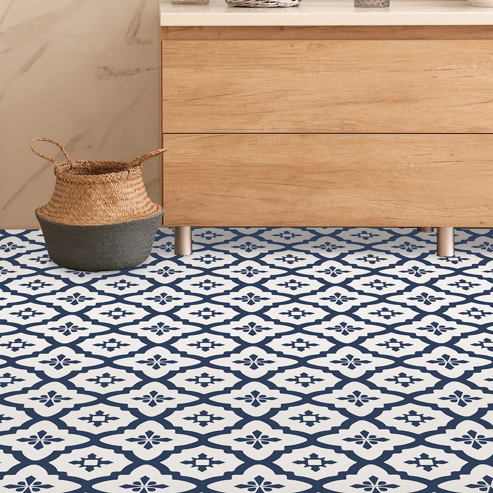 FloorPops Coastal Brand: FloorPops Match: NA Sheet Length: 12 Sheet Width: 12 # of Sheets: 10 This peel & stick floor tile features a classic quatrefoil design inked in deep blue Peel and stick to apply Easy installation - no grout or special tools needed Water resistant and washable Virgin Vinyl material with a textured low lustre finish and permanent adhesive makes tiles durable One package contains 10 tiles that each measure .06-in in depth Each tile measures 12 x 12 inches Floor Tiles Geometrics Coastal |