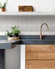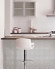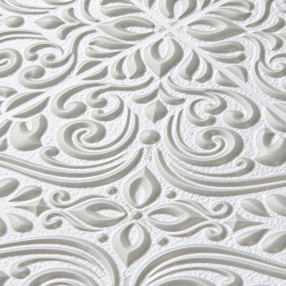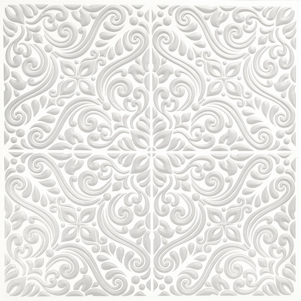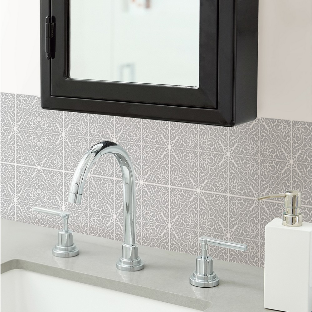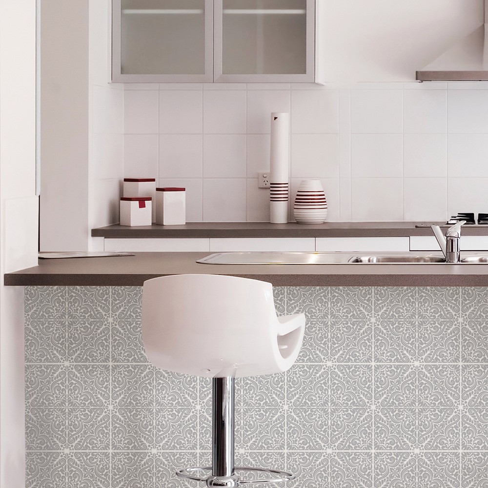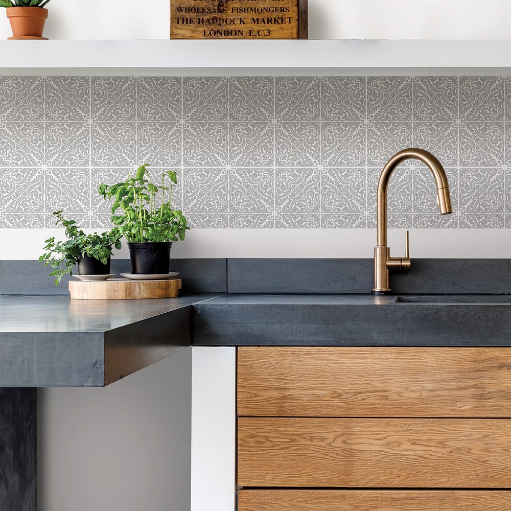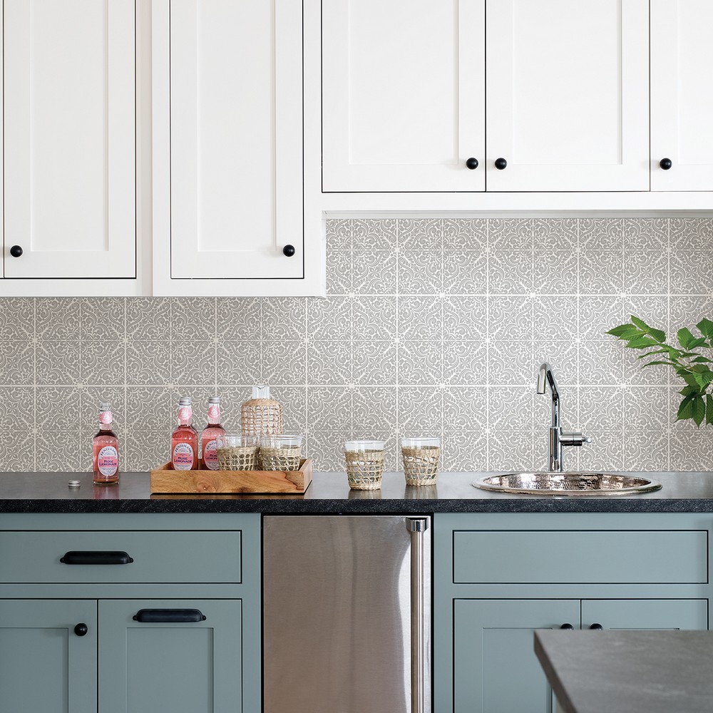 Grey and white backsplash with an embossed, bohemian design made easy to install with adhesive strips