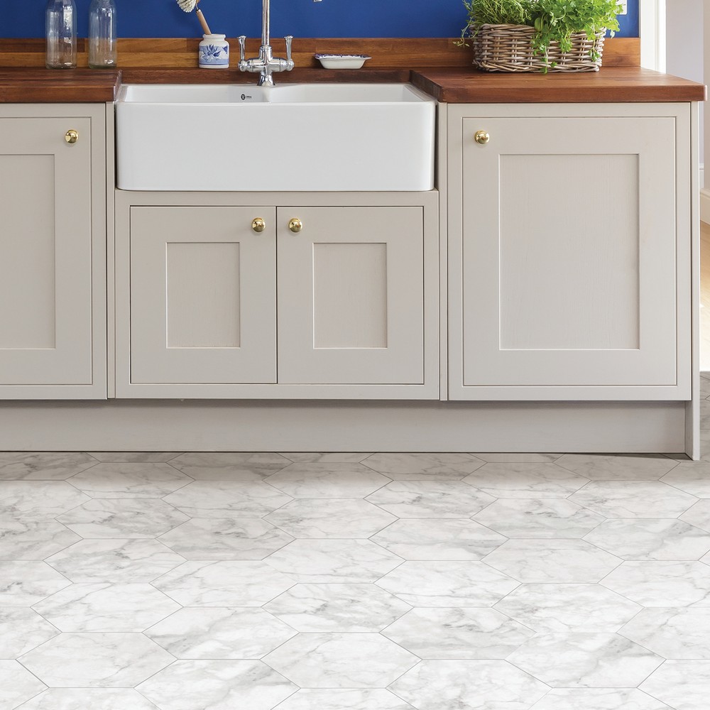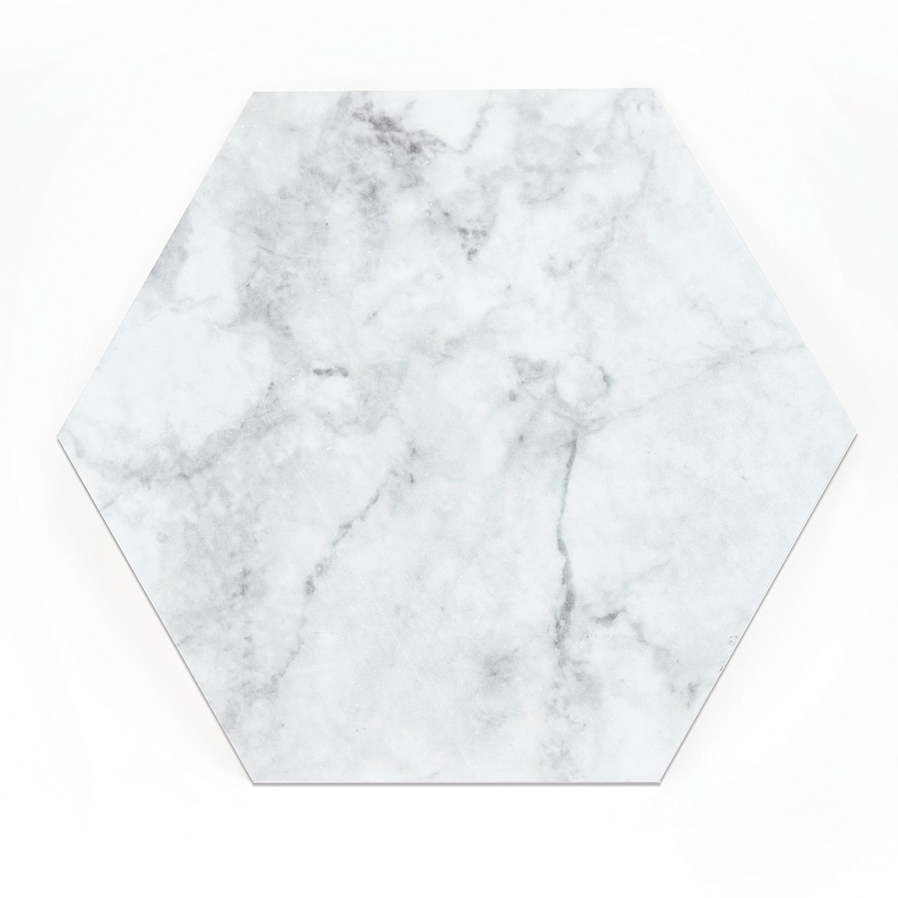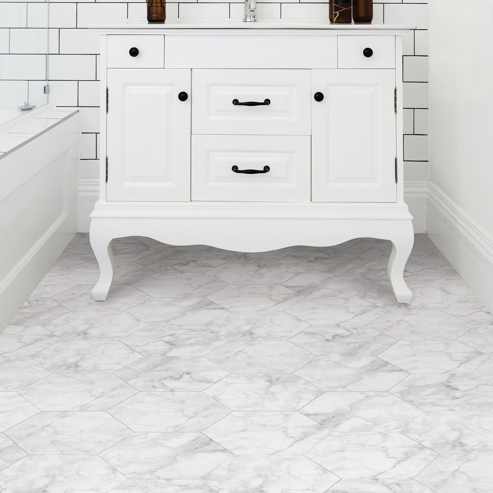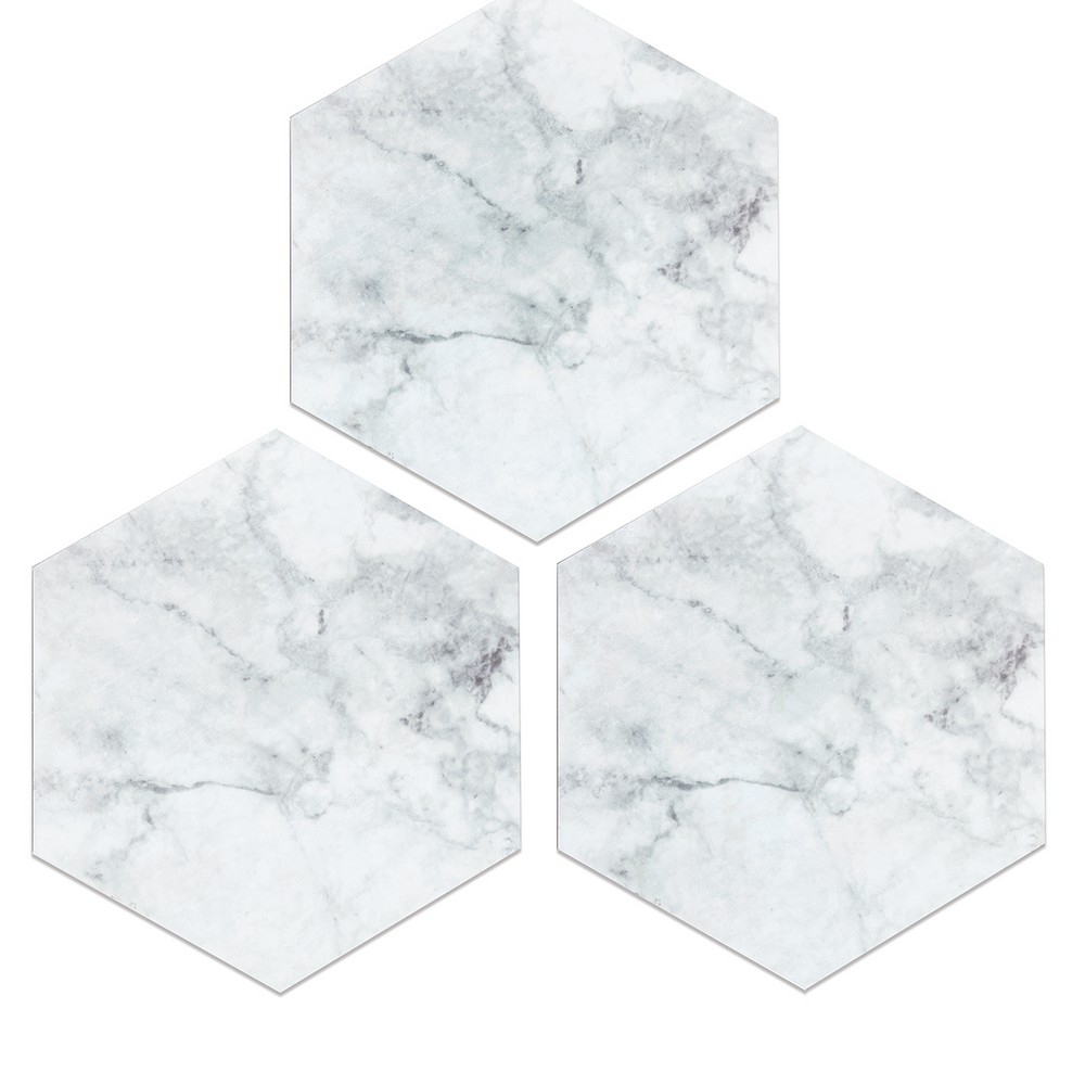 FloorPops Glam Brand: FloorPops Match: NA Sheet Length: 9 Sheet Width: 10.4 # of Sheets: 10 Marble inspired peel and stick hexagon floor tile Easy installation - no grout or special tools needed Water resistant and washable Virgin Vinyl material with a textured low lustre finish and permanent adhesive makes tiles durable One pack contains 10 hexagon tiles, each measuring 10.4 inches x 9 inches, with a thickness of .06 inches Each edge of the hexagon tile measures 5.25 inches One package covers 4.5 to 5 square feet Floor Tiles Stone Glam |