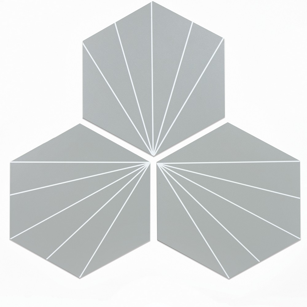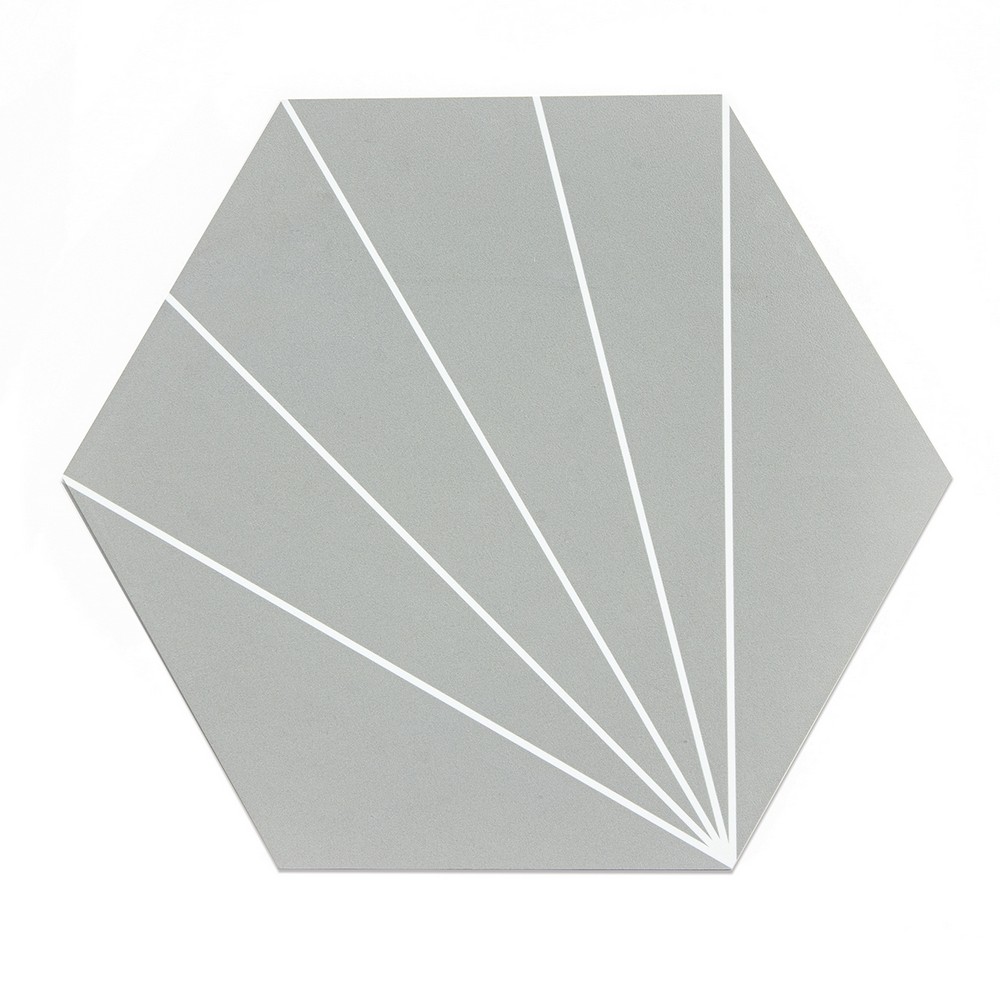 FloorPops current Brand: FloorPops Match: NA Sheet Length: 9 Sheet Width: 10.4 # of Sheets: 10 Abstract geometric peel and stick hexagon floor tile Easy installation - no grout or special tools needed Water resistant and washable Virgin Vinyl material with a textured low lustre finish and permanent adhesive makes tiles durable One pack contains 10 hexagon tiles, each measuring 10.4 inches x 9 inches, with a thickness of .06 inches Each edge of the hexagon tile measures 5.25 inches One package covers 4.5 to 5 square feet Floor Tiles Graphics current |