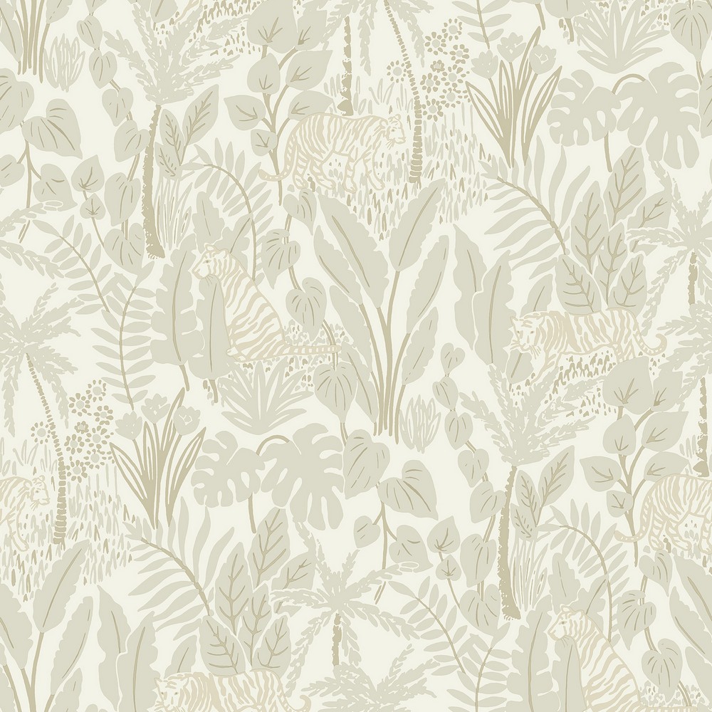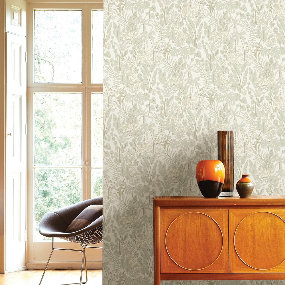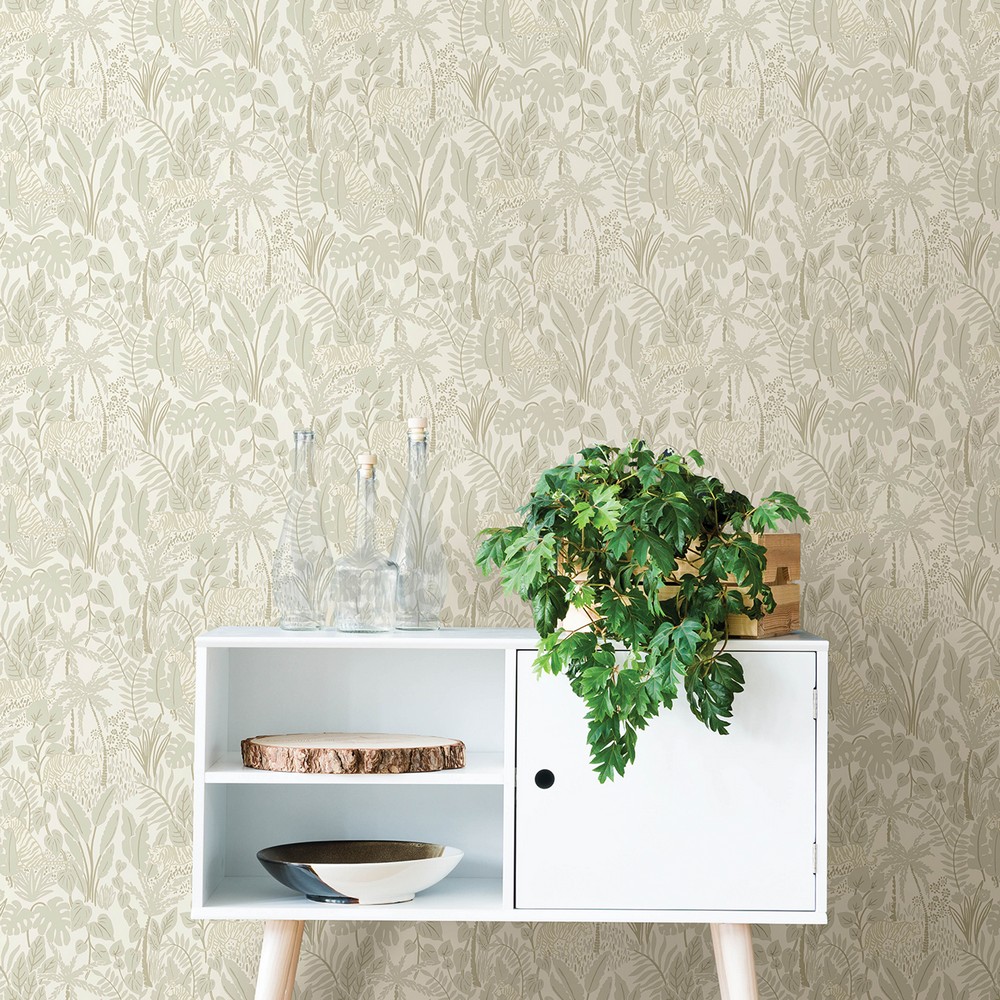 Neutral peel and stick wallpaper with a jungle-inspired theme