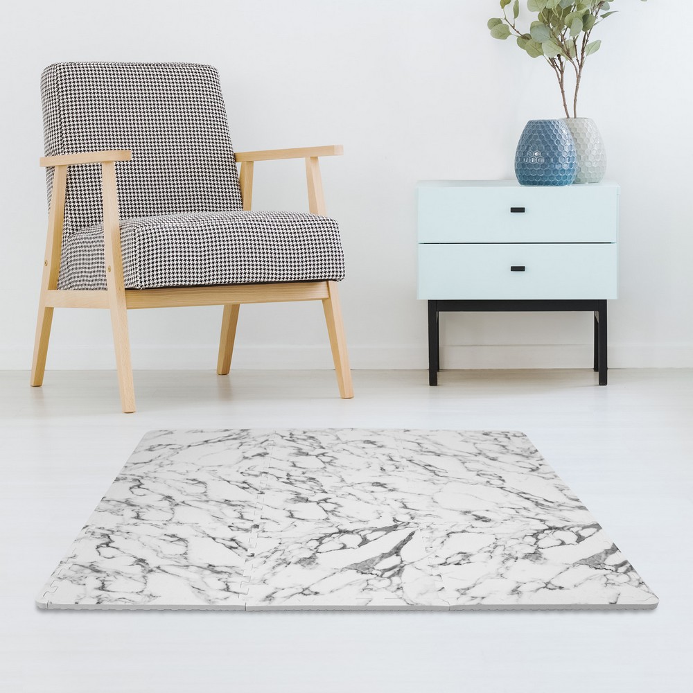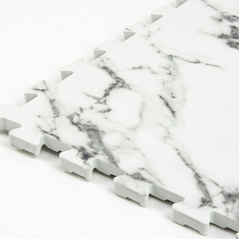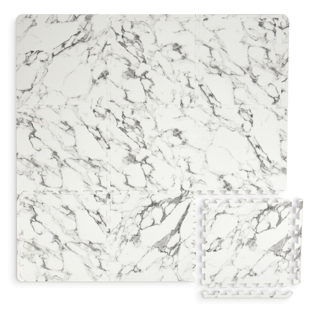 FloorPops current Brand: FloorPops Match: NA Sheet Length: 12 Sheet Width: 12 # of Sheets: 9 Marble foam tiles Non-toxic EVA foam material Water and liquid resistant, use a cloth and mild soap to clean Contains 22 pieces including 9 tiles that measure 12-in x 12-in and 13 edges Measures 36-in x 36-in x .4-in when fully assembled Covers about 9 square feet when assembled Interlocking foam tiles can be easily cut with a straight edge or scissors to fit around difficult corners or oddly shaped room Use a rubber mat underneath the foam tiles to achieve non-slip application Floor Tiles Stone current Floor Tiles |