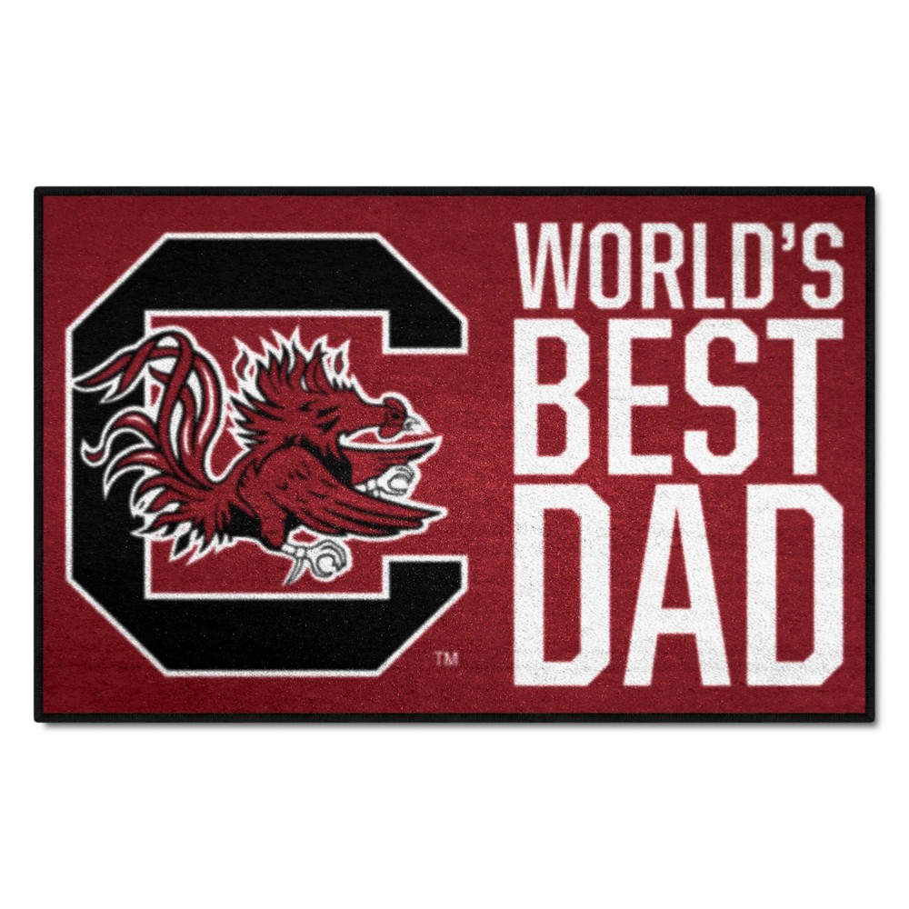 | South Carolina Gamecocks Starter Mat Accent Rug - 19in. x 30in. World's Best Dad Starter Mat 9 Ounce, 100 % Nylon Face Recycled vinyl backing for a durable and longer-lasting product Machine made and tufted in the USA Non-skid backing with serged borders for added durability Machine washable; vacuum regularly and spot clean for any easy and quick clean Officially licensed and chromojet-printed in true team colors for vibrant, lasting color University of South Carolina in South Carolina |