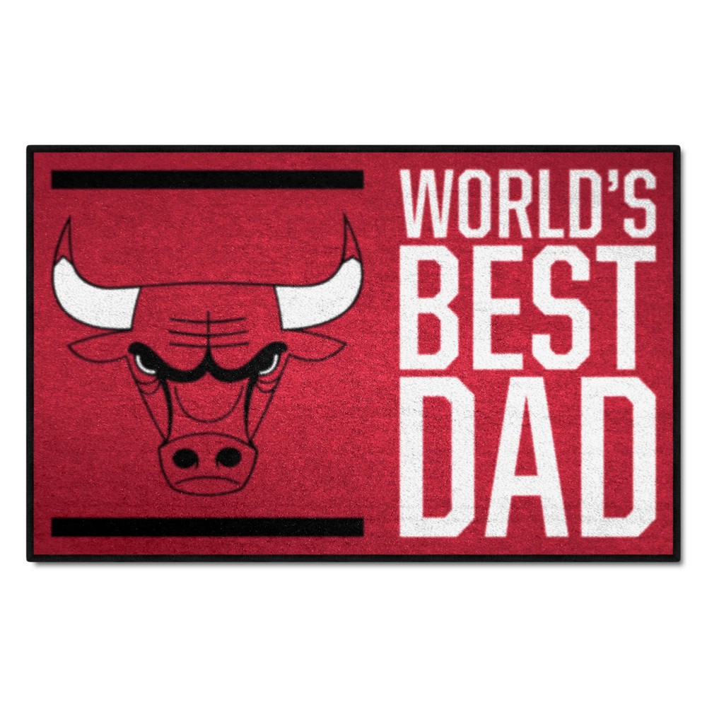 | Chicago Bulls Starter Mat Accent Rug - 19in. x 30in. World's Best Dad Starter Mat 9 Ounce, 100 % Nylon Face Recycled vinyl backing for a durable and longer-lasting product Machine made and tufted in the USA Non-skid backing with serged borders for added durability Machine washable; vacuum regularly and spot clean for any easy and quick clean Officially licensed and chromojet-printed in true team colors for vibrant, lasting color NBA - Chicago Bulls in Illinois NBA National Basketball Association |
