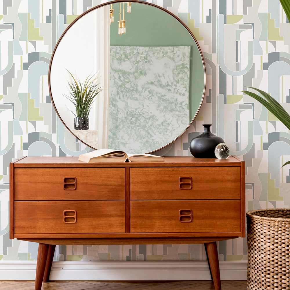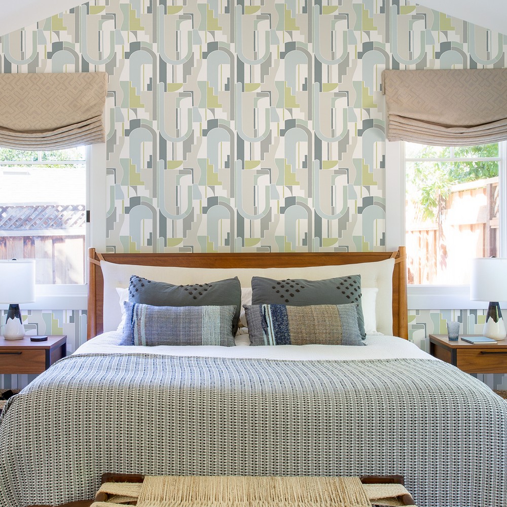 This retro-inspired geometric is the perfect blend of playful yet peaceful. The arched shapes and stairwell-like forms make topsy-turvy architecture colored an array of light blues, light greens, and greys. Odele is an unpasted, non woven wallpaper.