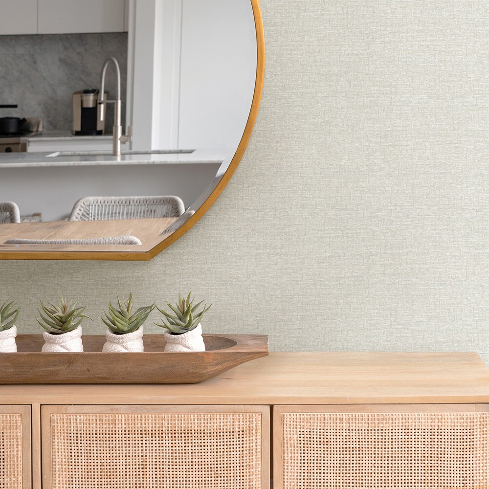 This textural, small-scale design will elevate your living room without demanding the spotlight. Light grey lines of raised inks form a subtle basketweave design across a cream faux grasscloth backdrop. Minerva is an unpasted, non woven wallpaper.