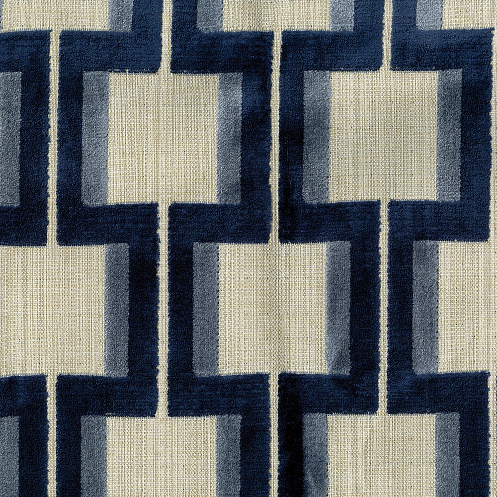 | ABBEYSHEA BlueVelvet Colors: Blue - Contemporary,Geometric,Velvet Backing: 100% Acrylic Kiss Coat PFAS Free,California Proposition 65 compliant Colorfastness to Light AATCC 16 - Grade 4, hours Decorative Accessories,Pillows,Residential Seating,Upholstery a cut velvet jacquard with geometric links, shown in our statement navy blue. |