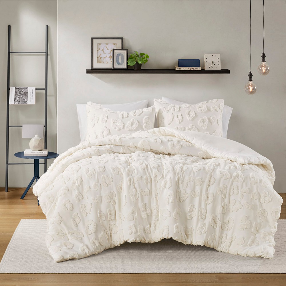 The Intelligent Design Larissa clipped chenille comforter set has a soft, textured animal design for a unique and modern flair. The off-white color is versatile and elegant, while the coordinating shams complete the bedding set. The hypoallergenic polyester comforter filling contains no allergens and is treated to be dustproof, ensuring a restful and comfortable sleeping experience. This comforter set is also OEKO-TEX certified and is machine washable for easy care.