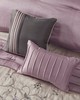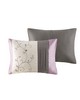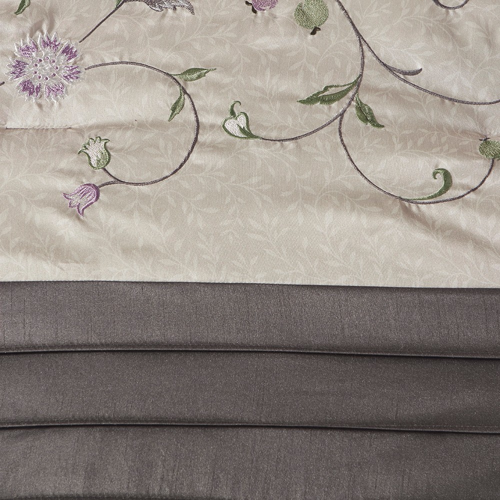 | Madison Park Cal King 1 Comforter: 104"W x 92"L 2 King Shams: 20"W x 36"L (2) 1 Bedskirt: 72"W x 84"L + 15"D 1 Decorative Pillow: 12"W x 16"L 1 Decorative Pillow: 12"W x 18"L 1 Decorative Pillow: 18"W x 18"L Comforter & Sham: 100% polyester polyoni, pieced, brushed polyester reverse, 270gsm polyester filling Bedskirt: 100% polyester polyoni, polyester platform Pillows: polyoni cover and polyester filling Traditional Style Includes 7 Piece(s) MACHINE WASH COLD, GENTLE CYCLE, AND SEPARATELY. DO NOT BLEACH. TUMBLE DRY LOW, REMOVE PROMPTLY, DO NOT IRON. IF THERE IS NO FREE MOVEMENT IN THE WASHER OR DRYER, USE LARGE CAPACITY COMMERCIAL WASHER/DRYER. The Serene Bedding Collection provides an elegant look to your home. The top of the comforter is a mix of soft purple, charcoal grey, and light grey with piecing details while the light grey section has an embroidered floral pattern for a soft divide from these bold colors. Made from polyester dupioni, this fabric will produce a shine and pick up the light on both the comforter and shams. The decorative pillows come in a combination of solids, stripes, and embroidery to pull this whole set together. Items in the set may come in a rolled or compressed packaging, which will need to be fluffed up or steam ironed before use to remove wrinkles. |