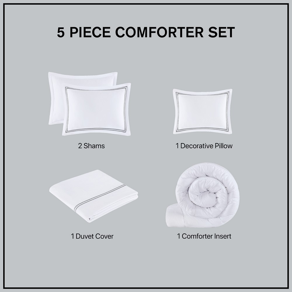 1 White/Grey 100% Cotton Sateen Embroidered Comforter Set Queen