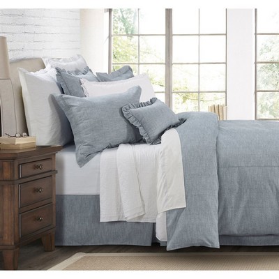 The gorgeous pale blue Chambray comforter set will give your bedroom a serene and relaxing feel. This comforter set works beautifully alone or add accessory pieces to create your own unique look. 2 piece twin set includes comforter and (1) standard pillow sham. Measurements: twin comforter 68" X 88", standard pillow sham 21" X 27". Dry clean recommended. Comforter: face: 15% linen/ 45% cotton/ 40% polyester, back: 100% cotton, filling: 100% polyester; sham: 15% linen/45% cotton/40% polyester. Imported.