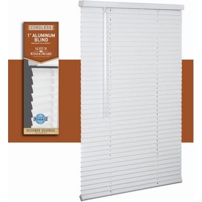 The 1" Cordless Mini Blind is engineered using static and crease resistant aluminum slats, designed to spring back if pulled out of shape. These cordless metal mini blinds feature a roll formed steel headrail and bottom rail to provide maximum support for the smooth up and down cordless operation. The cordless metal blinds also feature a modern sleek headrail eliminating the need for valance slats, although two slats and clips are provided. The Cordless 1" Aluminum Metal Mini Blind is easy to install and ships complete with hardware, wand for tilting, inside/outside mounting brackets, and instructions. While being high quality, these cordless mini blinds are the cheapest we offer and at discount prices. Our 1"cordless aluminum mini blinds come in standard sizes that are boxed and ready for immediate shipment. The aluminum cordless metal blind chart below shows the length in bold followed by all the available standard widths. The stock discount priced cordless mini blinds are an excellent choice for home, office or apartment buildings. Custom cutting options are available.