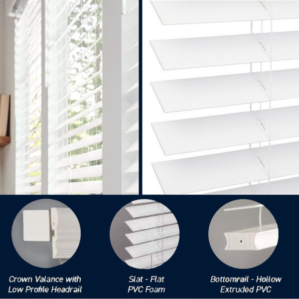 Looking for a window blind that perfectly imitates wood while being more durable? Look no further than our 2" Faux Wood Blind! Its steel headrail and newly developed memory flexible technology makes it stand out against other window blinds on the market. In addition, our 2" Faux Wood Blind is also very easy to operate. The specially engineered hollow bottomrail ensures that the slats stay perfectly aligned while being raised or lowered. So why wait? Get the best of both worlds with our 2" Faux Wood Blind!