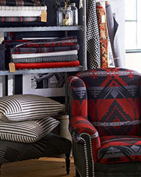 West Village drapery and upholstery fabrics offer rich wool plaids to soft corduroys, sheers and casements in these stylish and chic fabrics. These Ralph Lauren Fabrics feature the striking color combinations of black, red, and cream in stripes, plaids, tradeblankets and patchwork patterns.