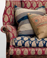 The Artiste De La Mer drapery and upholstery fabrics by Ralph Lauren features a chic seaside palette of red, bright blue and crisp white showcased by washed batik prints, ticking stripes and artful embroidered details. Featuring rustic linen and ultrasoft cotton, these textural Ralph Lauren Fabrics embodies an eclectic spirit and carefree attitude.